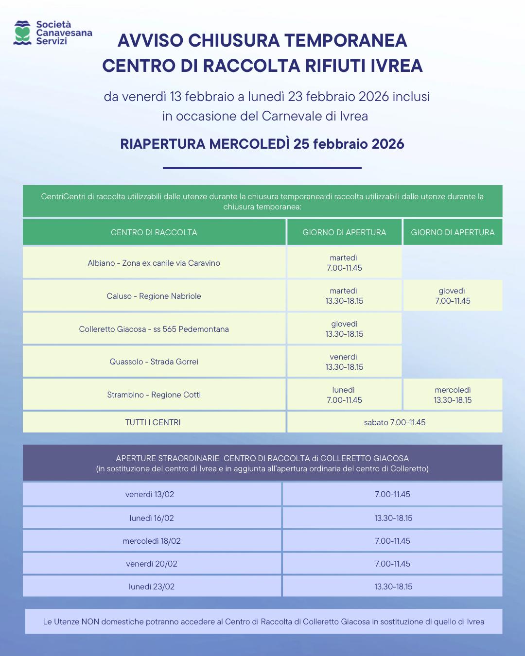da venerdì 13 febbraio a lunedì 23 febbraio 2026 inclusi - riapertura mercoledì 25 febbraio 2026 in occasione del Carnevale di Ivrea